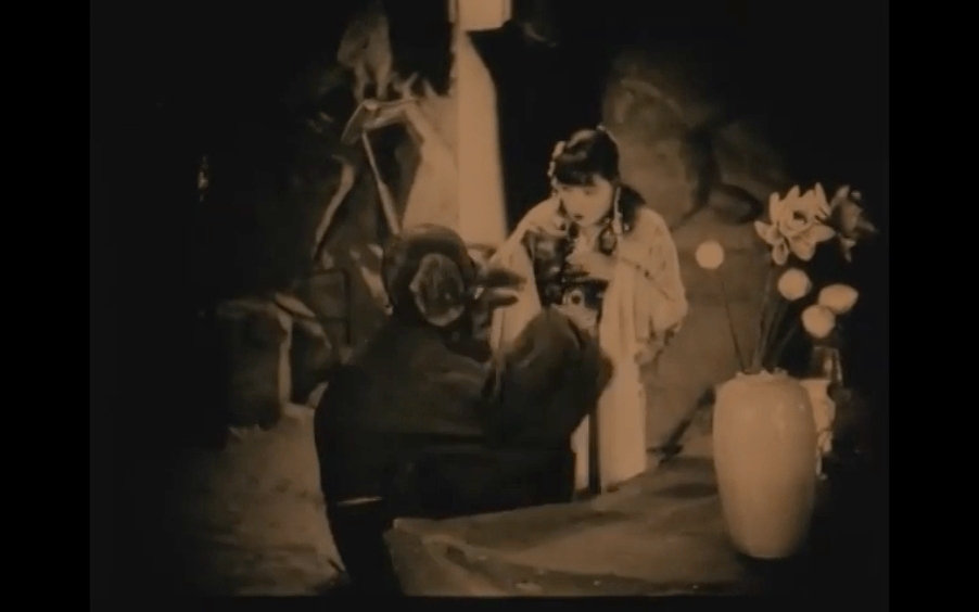 The novel draws upon the real-life travels of the Buddhist monk Xuanzang and tells the stories of his journey towards India with his guardians Monkey, Pig, and Sandy; and in Pan Si Dong we meet these characters as they come up against spider-demon seductresses, who spin their webs, dance, and even change form as they attempt to entice and eat the protagonists. As Dr Huang also discussed, Pan Si Dong is a unique treasure considering how few prints have survived from this period of early Chinese cinema, but even more so for the preservation of its colours and use of technology. Vivid atmospheric effects have been achieved in the film by a ‘tinting’ colour process, which involves submerging the filmstrip in tanks of dye. In the final scenes of the film, for instance, a vibrant magenta colour illustrates the cascading, rising fire throughout the cave, clarifying the danger, and framing the emotional height of those final moments as the protagonists struggle to escape in vibrant red hues. Indeed, this atmospheric chromatism was common in films of the silent era, particularly as a means to show changes in the environment or lighting (inside or outside, day or night), but it was a special joy to have a chance to view Pan Si Dong’s experimentation with colour via a screened projection of the 35mm print, especially due to its particular vividness.