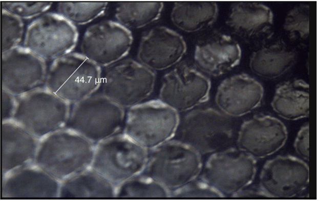 Figure 4 (above left) image of the grain of the film: Cinecolor, two-colour, 1932-1950 using microscopy. Credit: Gert Koshofer Collection. Sample No.17. Photomicrograph by Sreya Chatterjee, HTW Berlin. (above right) Hexagonal structure of the lenticular surface of the Keller-Dorian lenticular film. Microscopy revealed the lenticular surface, as part of an embossed screen-like process, which enabled colour information to be registered in combination with black-and-white film. Credit: David Pfluger, ERC Advanced Grant FilmColors. Imaging was performed with support of the Center for Microscopy and Image Analysis, University of Zurich.
