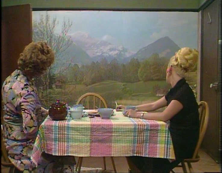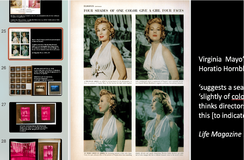 Top left: Exploring Elisofon’s influence as Special Color Consultant for Moulin Rouge (John Huston, 1952) and Bell, Book and Candle (Richard Quine, 1958). Top right: Jan Faull’s presentation on Captain John Noel and colour pictures, through Tibet to Everest. Lower left: Hilda’s Mural. Coronation Street. Episode 1617, 14 July 1976. Directed by Bill Gilmour. Granada Television. Middle right: Collage by Cathy Lomax for ‘”Blue is a problem”: coloured eyeshadow in films of the 1950s and 1960s.’ Lower right: for Kirsten Moana Thompson’s research on “”The Doors of Perception: Hallucinatory Animation, Disney and Color”.